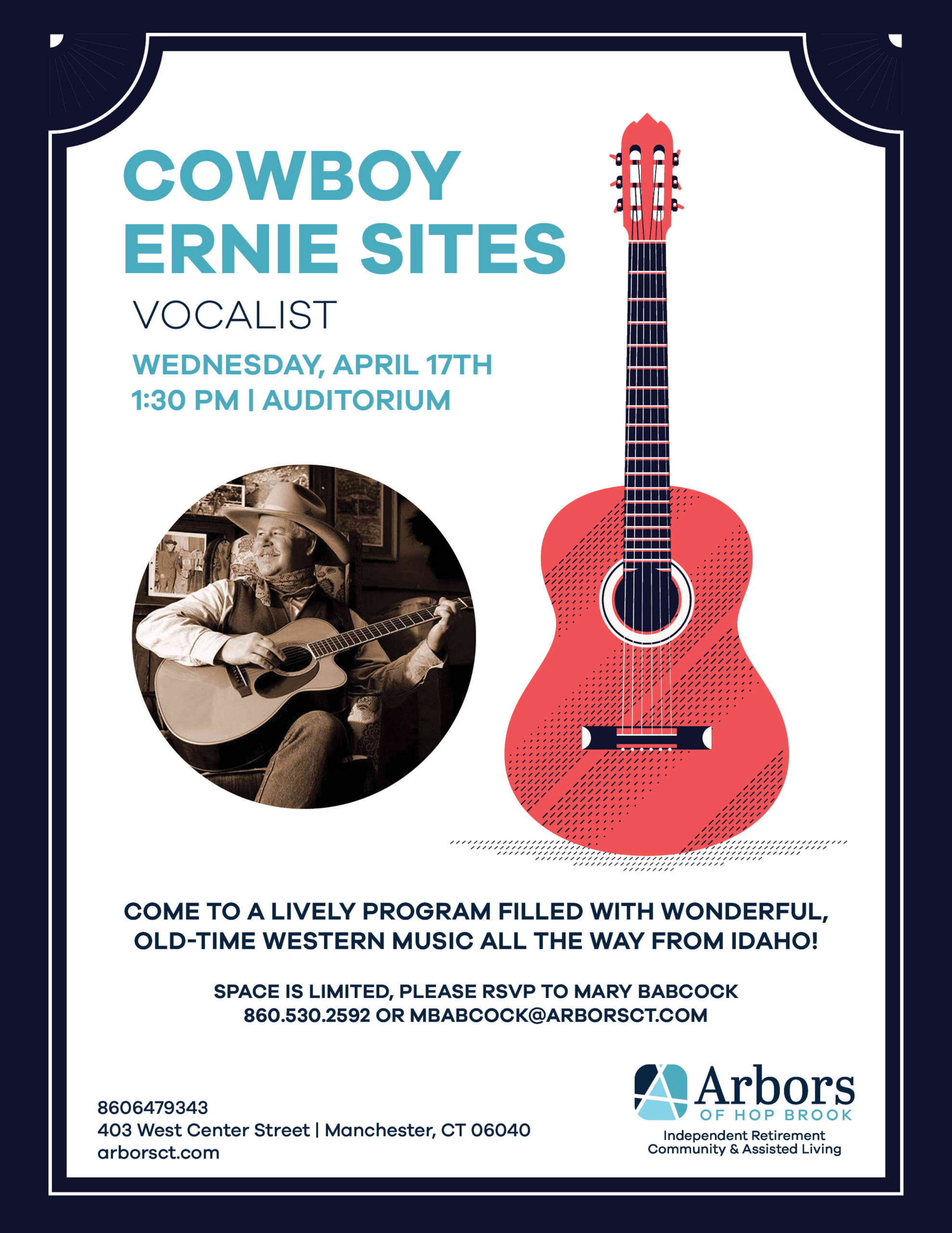 Join us on Wednesday, April 17th at 1:30 PM in the auditorium for free concert featuring wonderful, old-time western music with Cowboy Ernie Sites! Please RSVP to save your spot by contacting Mary Babcock via email at mbabcock@arborsct.com or calling at 860.533.2524.