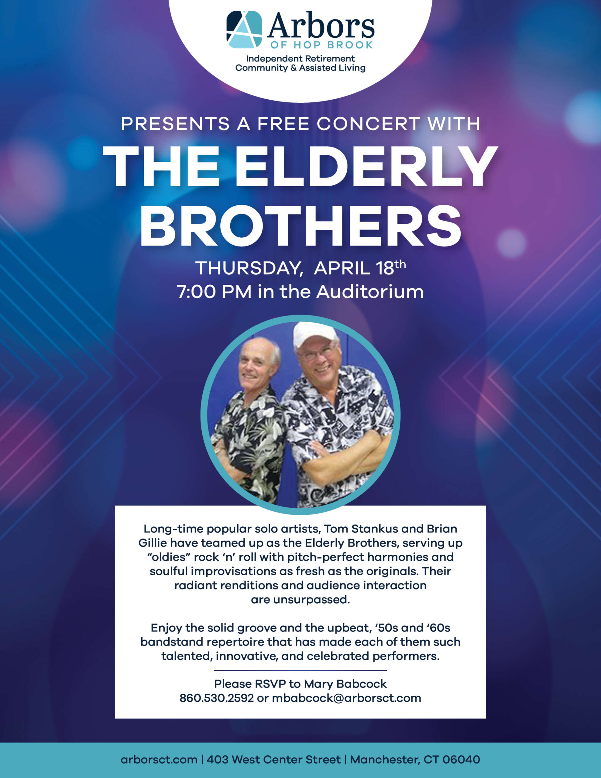 Posted on April 4, 2024 / 0 / joel The Elderly Brothers Join us on Thursday, April 18th at 7:00 PM in the auditorium for free concert with The Elderly Brothers! Please RSVP to save your spot by contacting Mary Babcock via email at mbabcock@arborsct.com or calling at 860.533.2524. News and Information - Past Events